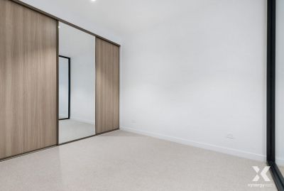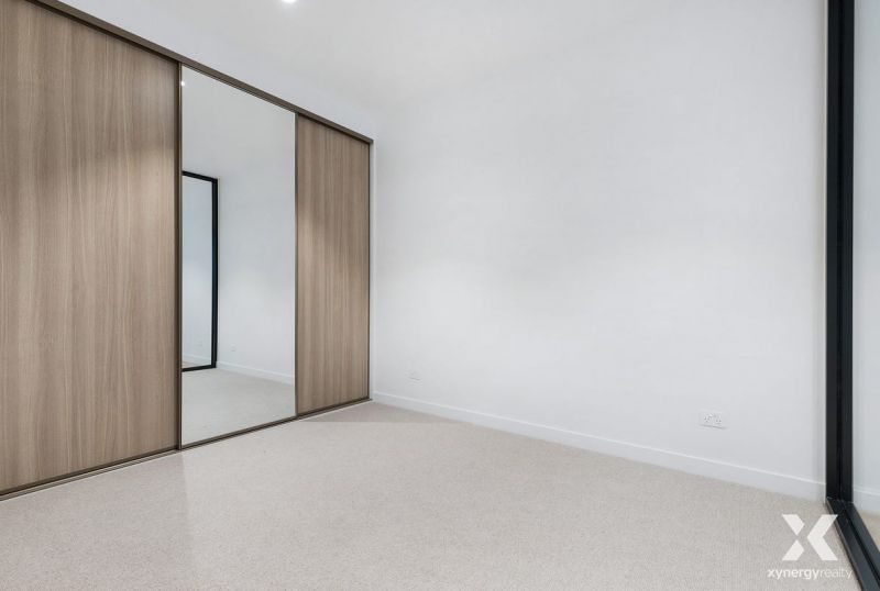 Inside, the light-filled open-plan living and dining area showcases warm timber flooring and full-height glass doors opening onto a private balcony, creating an inviting space for everyday living. The contemporary kitchen is designed for ease, complete with stone benchtops, generous storage, and premium appliances.