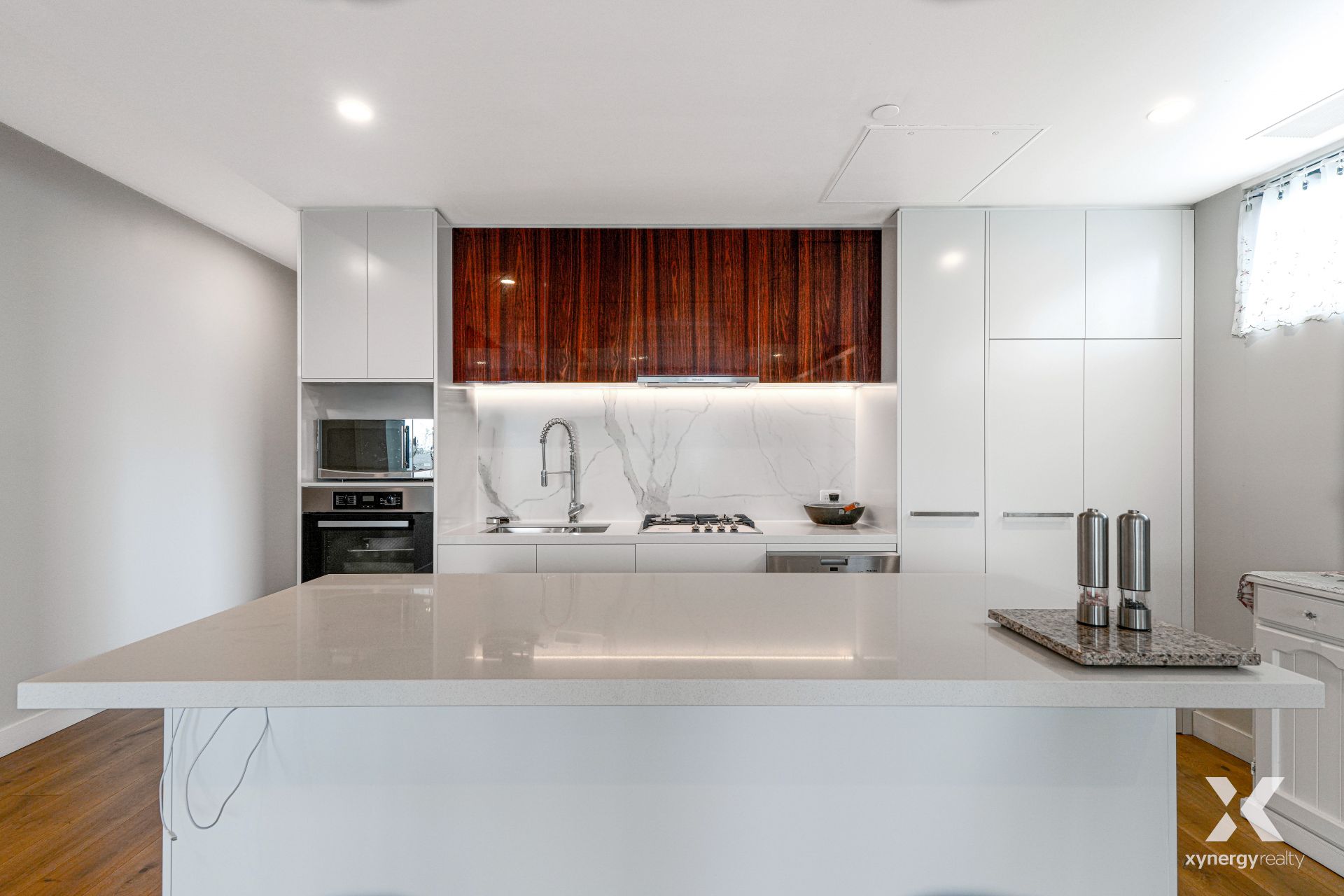 Step inside to a bright open-plan living and dining area featuring timber flooring and a true north-facing orientation that welcomes sunlight throughout the day. Glass sliding doors extend the space to an expansive balcony, perfect for relaxing or entertaining. At the heart of the home, the well-appointed kitchen showcases stone benchtops, quality stainless steel appliances, and ample storage, thoughtfully designed for easy everyday living.