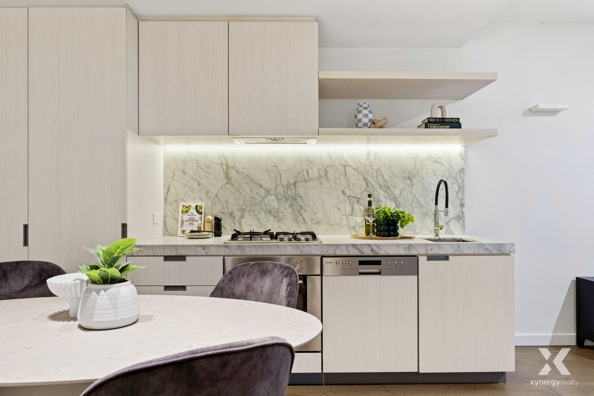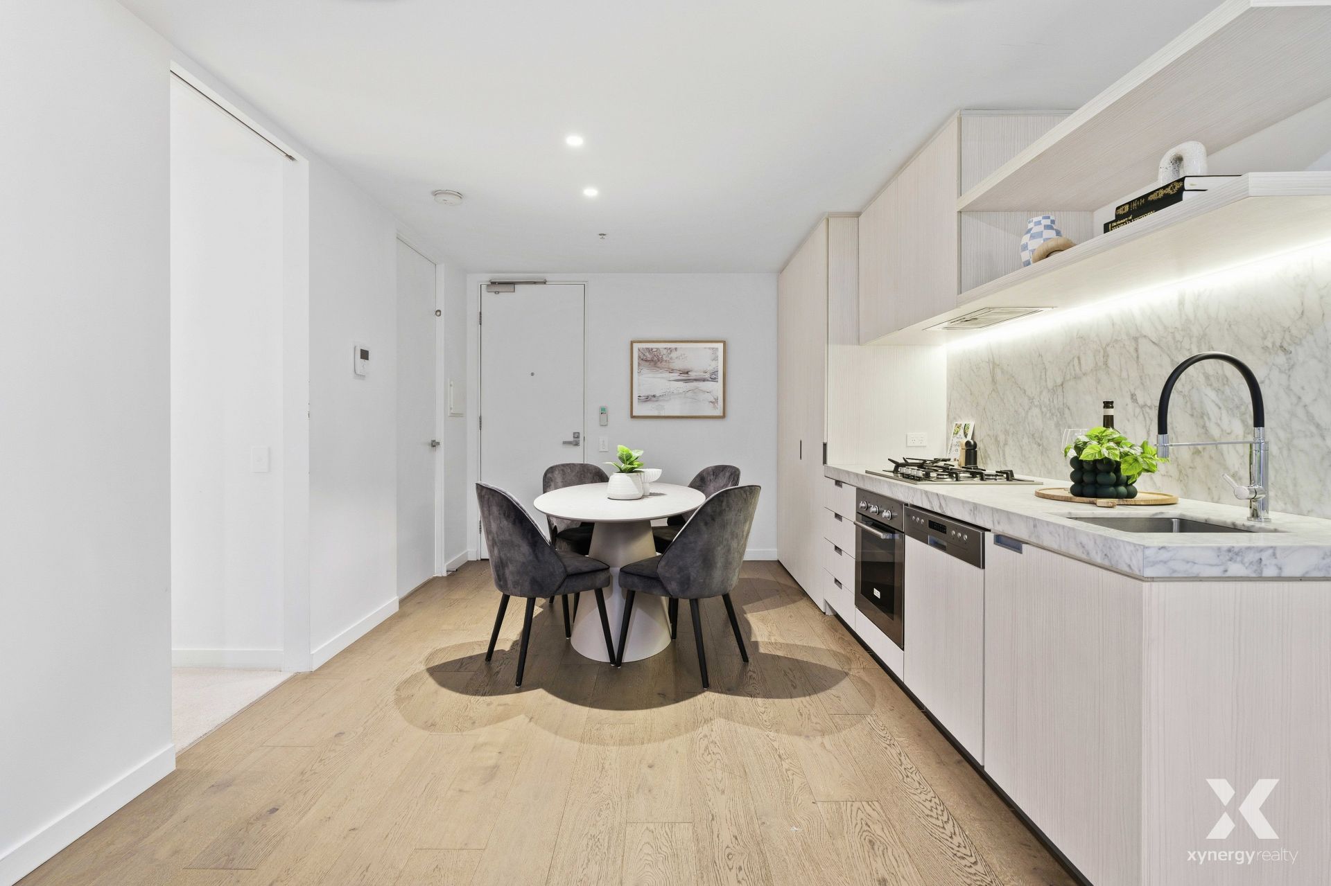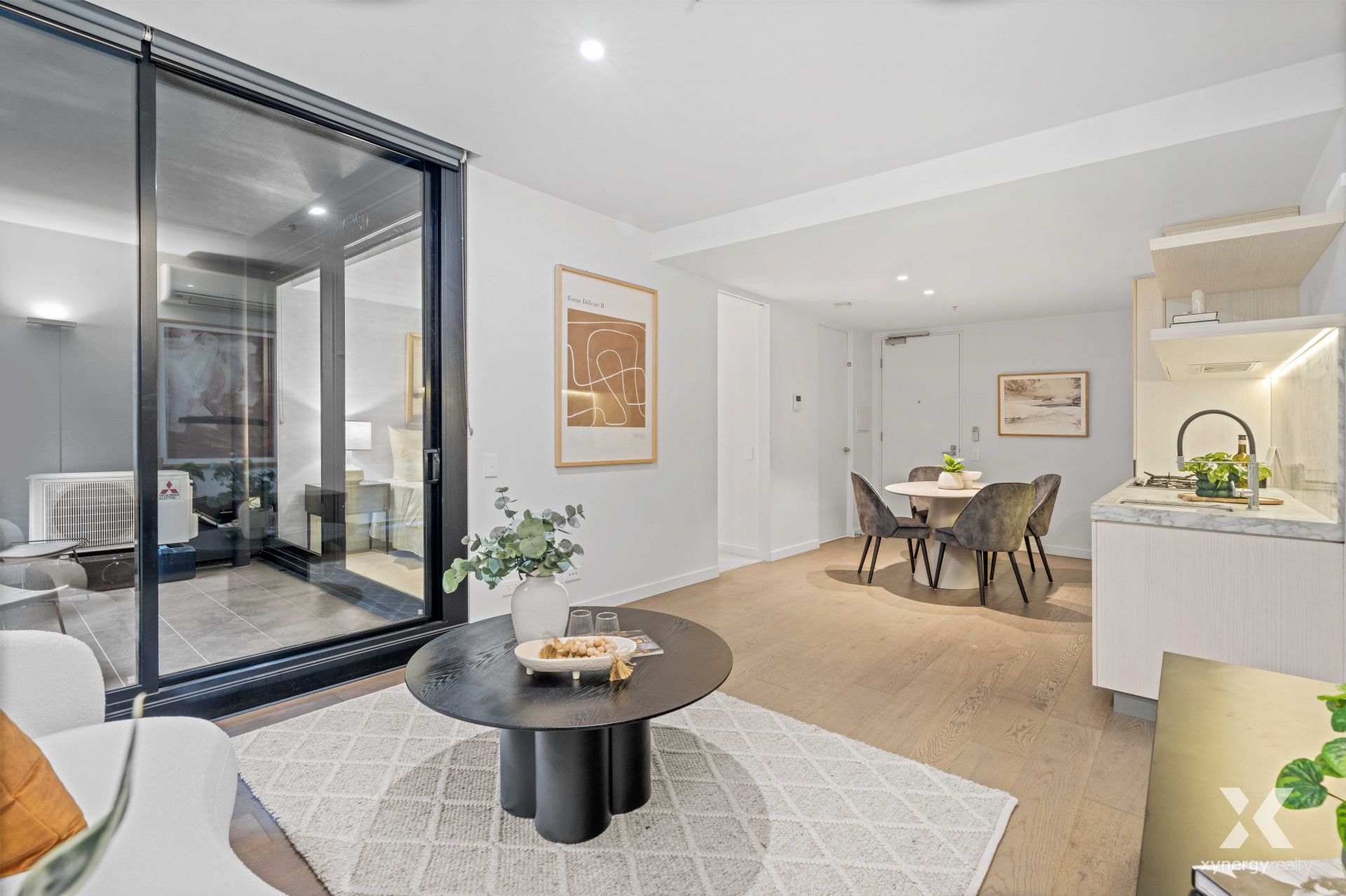 The intelligently designed interior showcases a light-filled open-plan living and dining zone, seamlessly connecting to a private, covered balcony that extends the living space outdoors. A sleek kitchen anchors the home with premium finishes, including elegant marble benchtops and quality integrated appliances, catering perfectly to both daily living and entertaining.